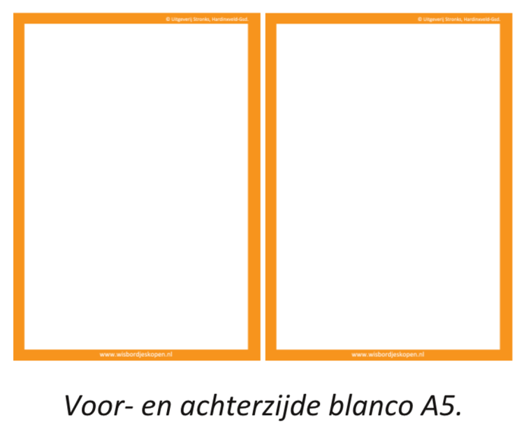 Op 300 grams dun karton geprinte dubbelzijdige invulbladen, glanzend gelamineerd met stevige 125 micron lamineerhoezen. Compact A5-formaat. Voorzijde: blanco. Achterzijde: blanco.