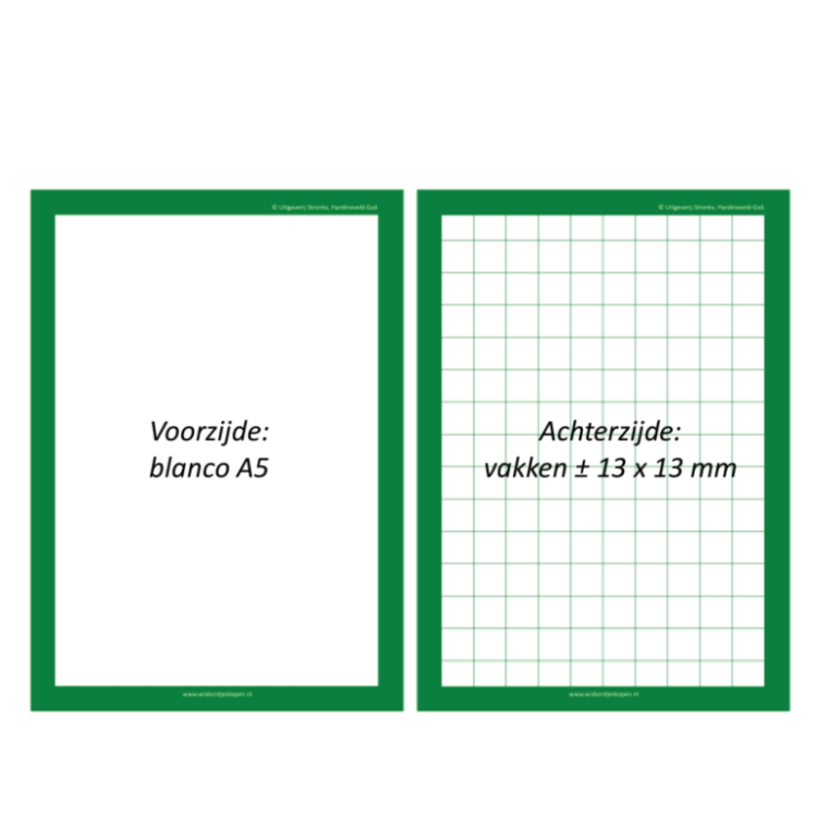 Op 300 grams silk karton geprinte dubbelzijdige invulbladen, glanzend gelamineerd met stevige 125 micron lamineerhoezen. Compact A5-formaat. Voorzijde: blanco. Achterzijde: vakken (± 13 x 13 mm).